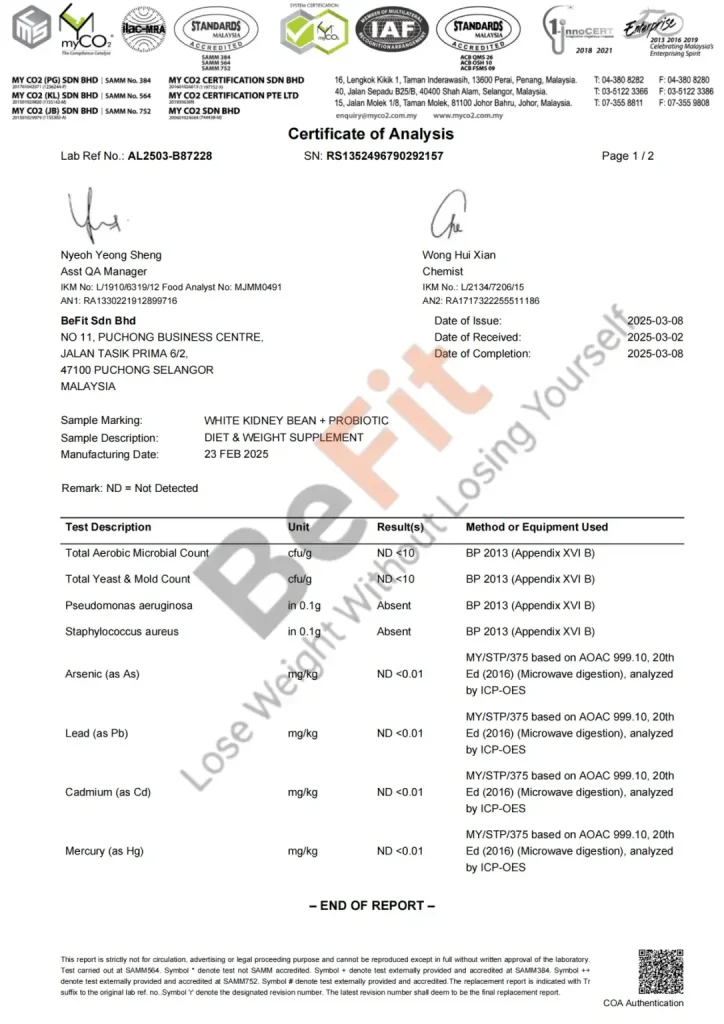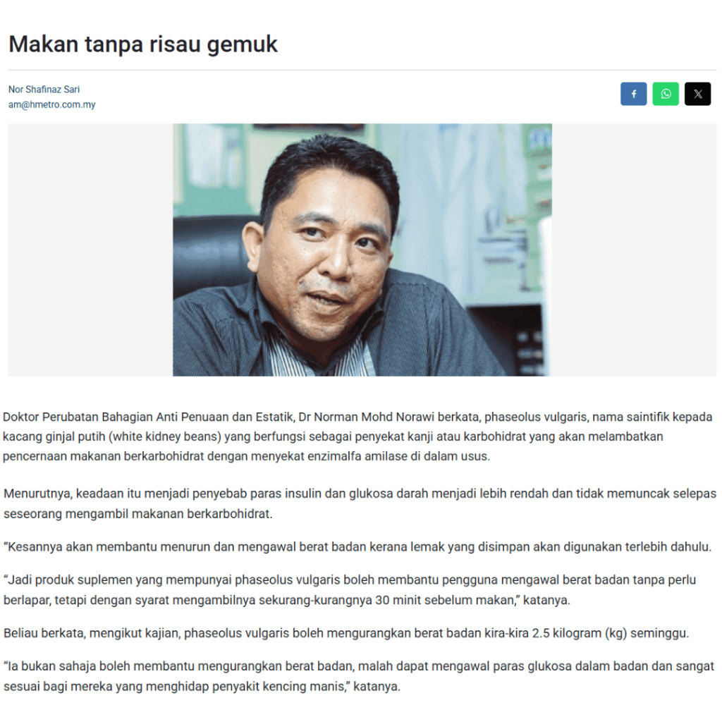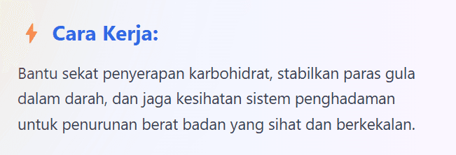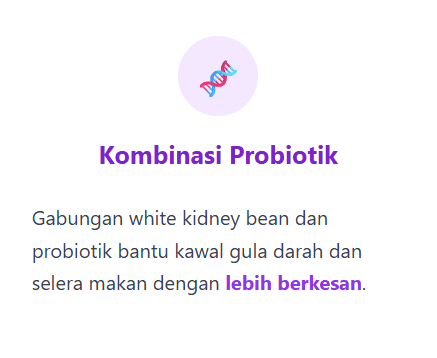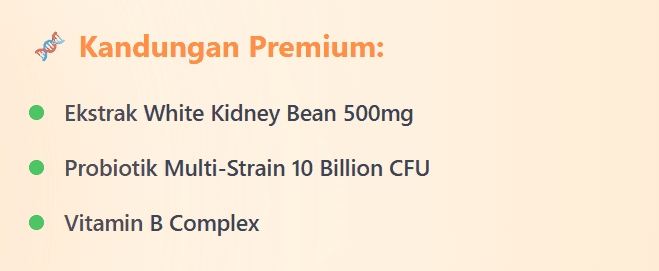 Produk ini diformulasi daripada bahan semulajadi seperti ekstrak White Kidney Bean dan probiotik premium, serta menggunakan vege kapsul yang bebas gelatin haiwan.